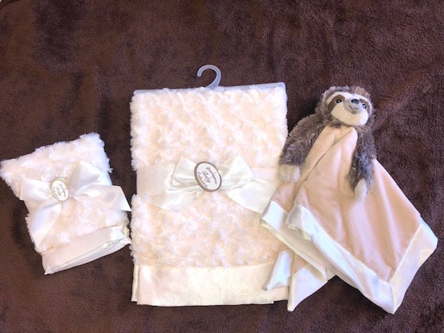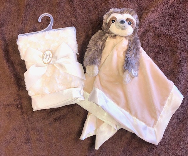 Adorable personalized snuggle buddy Sets available in Sloth. Soft velvet with satin backing with your little ones name making it even more special.